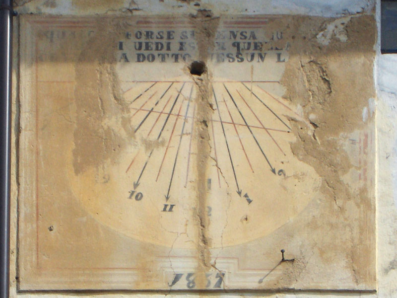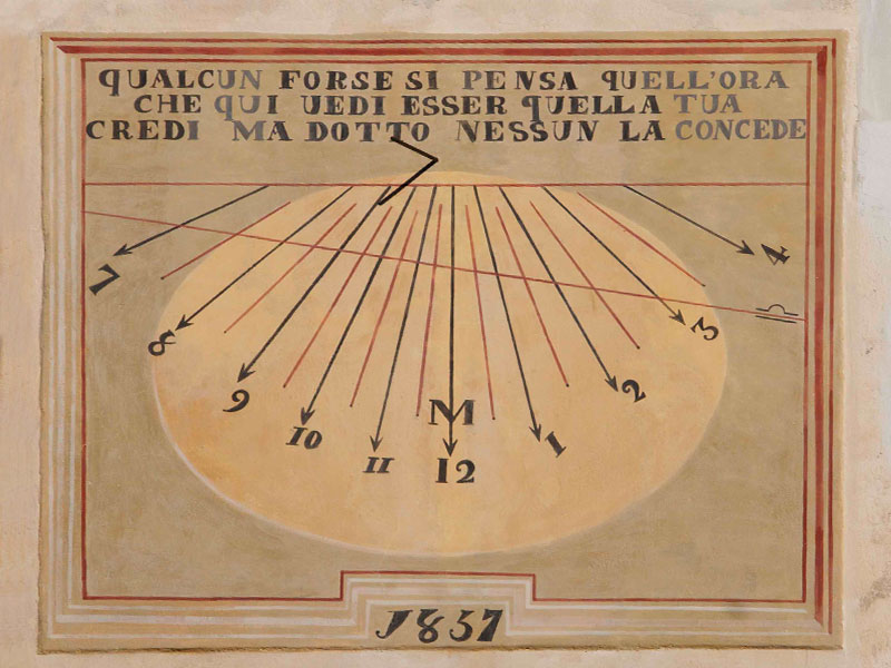 Sul quadrante ottocentesco, datato 1837, è presente un motto in italiano, il cui significato porta l’osservatore a riflettere sulla sua vita e su quanto sia inutile ed impossibile conoscere l’ora della propria esistenza, recita infatti: