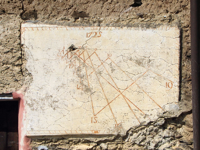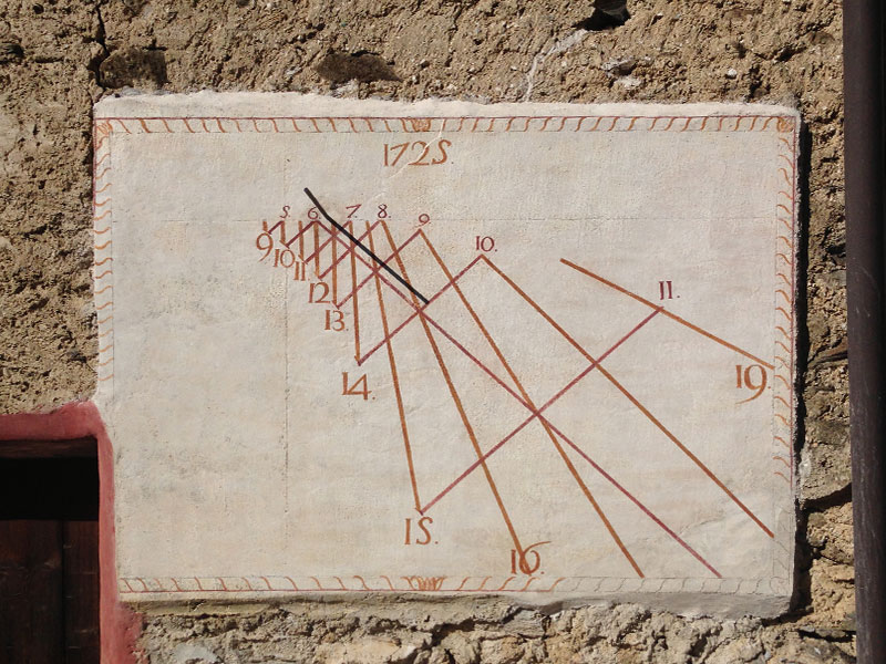 Questo quadrante solare datato 1725 utilizza un sistema orario concettualmente diverso da quello attuale perché suddivide il giorno in 24 ore, ma a partire dal tramonto. Indica infatti quante ore di luce mancano al calar del sole. Un metodo pratico per organizzare le attività in un’epoca priva di illuminazione artificiale.