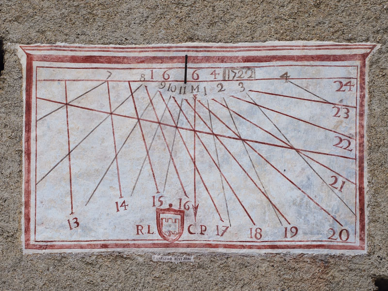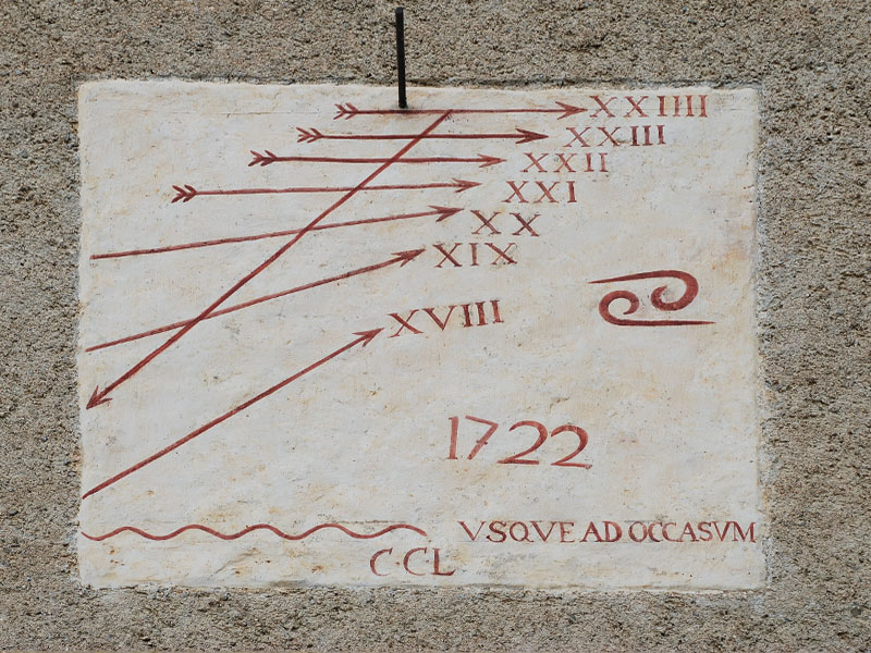 e la sigla CCL, probabile committente. Questo quadrante raffigura anche il simbolo zodiacale del Cancro, unico elemento astrologico presente sull’intero complesso gnomonico. Potrebbe essere stato realizzato per ricostruire di un quadrante occidentale perduto o per crearne uno nuovo per completare l’insieme.
