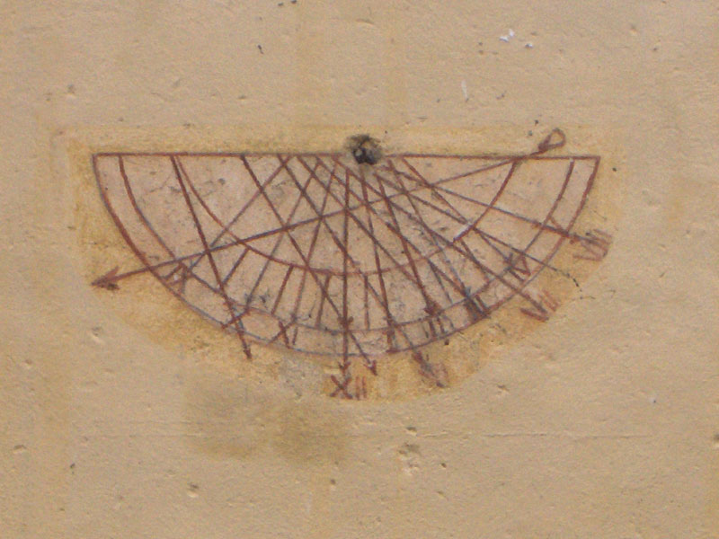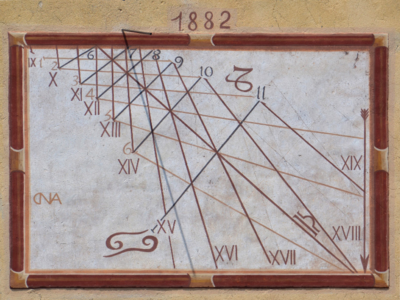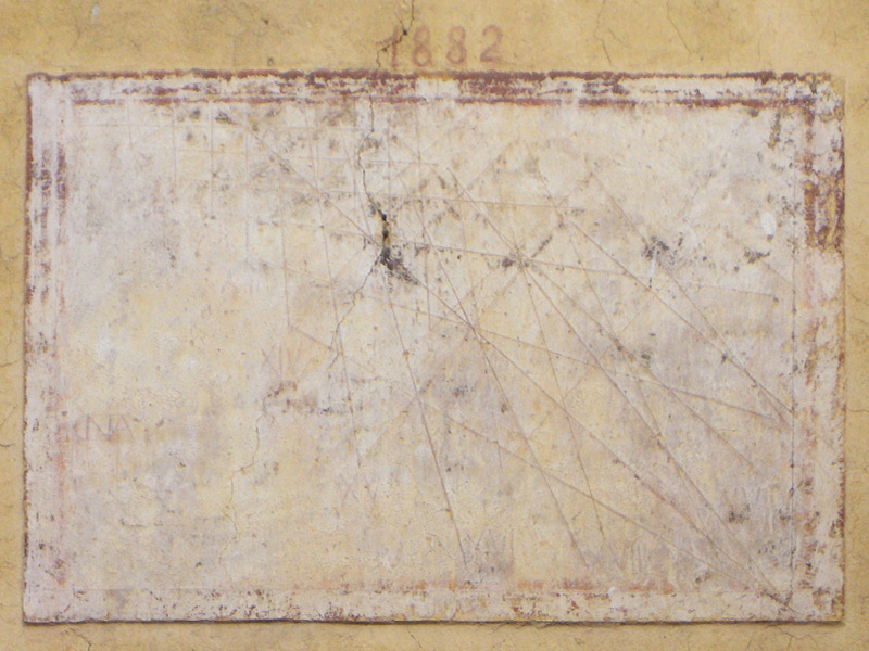 Per quanto riguarda la linea meridiana, si ipotizza che possa essere stata realizzata nella seconda metà del 700. La data 1882, visibile appena sopra il quadrante orientale, non si riferisce allo strumento, ma uno degli interventi di trasformazione o riparazione dell’edificio.
