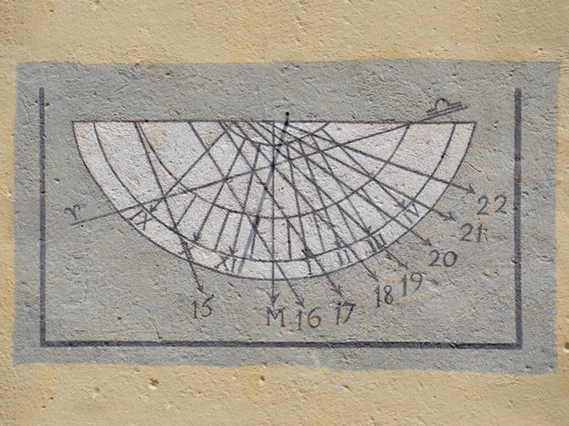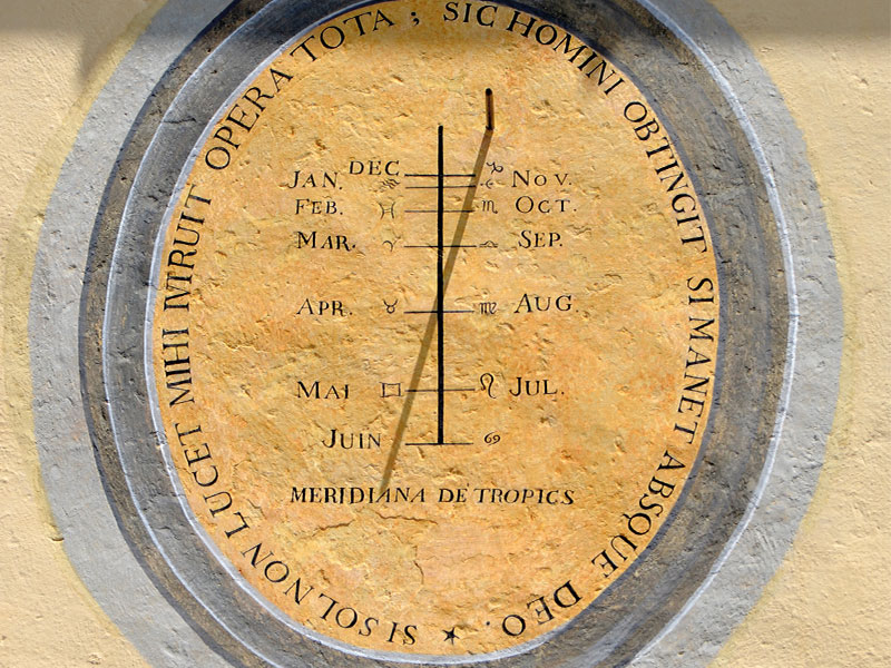Una buona dose di fortuna, accompagnata dall’esperienza di Fabio Garnero, il restauratore incaricato del recupero, ha permesso di risalire alla presenza della linea meridiana completa di calendario mensile. Questa linea fu ritinteggiata completamente negli anni 70′, dopo alcuni danni alla facciata della chiesa. In un momento di luce radente, durante le prime fasi del restauro del quadrante solare meridionale, Garnero notò un foro con accanto delle deboli incisioni dell’intonaco. Una rapida campagna di saggi stratigrafici ha confermato le prime ipotesi portando alla luce lo strumento. Un’ulteriore curiosità: le diciture dei mesi tracciate sul calendario della linea meridiana, seppur abbreviate, sono in francese. Forse l’autore veniva da oltralpe o, semplicemente, la traccia dell’uso veniva fatta nel francese nei testi istituzionali.