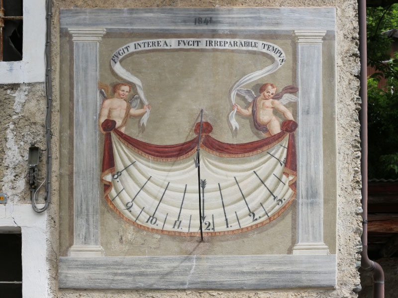 Il recupero del quadrante solare sulla Canonica di Canosio è avvenuto nel 2013. Lo strumento è un “semplice orologio” che ci permette la lettura delle ore locali, anche dette francesi, con una demarcazione scansionata alle mezzore e funziona grazie all’ombra di uno gnomone polare. La semplicità del suo meccanismo è però racchiusa nella cornice di una bellissima composizione pittorica: le ore sono adagiate su un drappeggio sostenuto da due putti e il tutto è attorniato da una finta architettura classica ad edicola con pilastri e travi modanate.